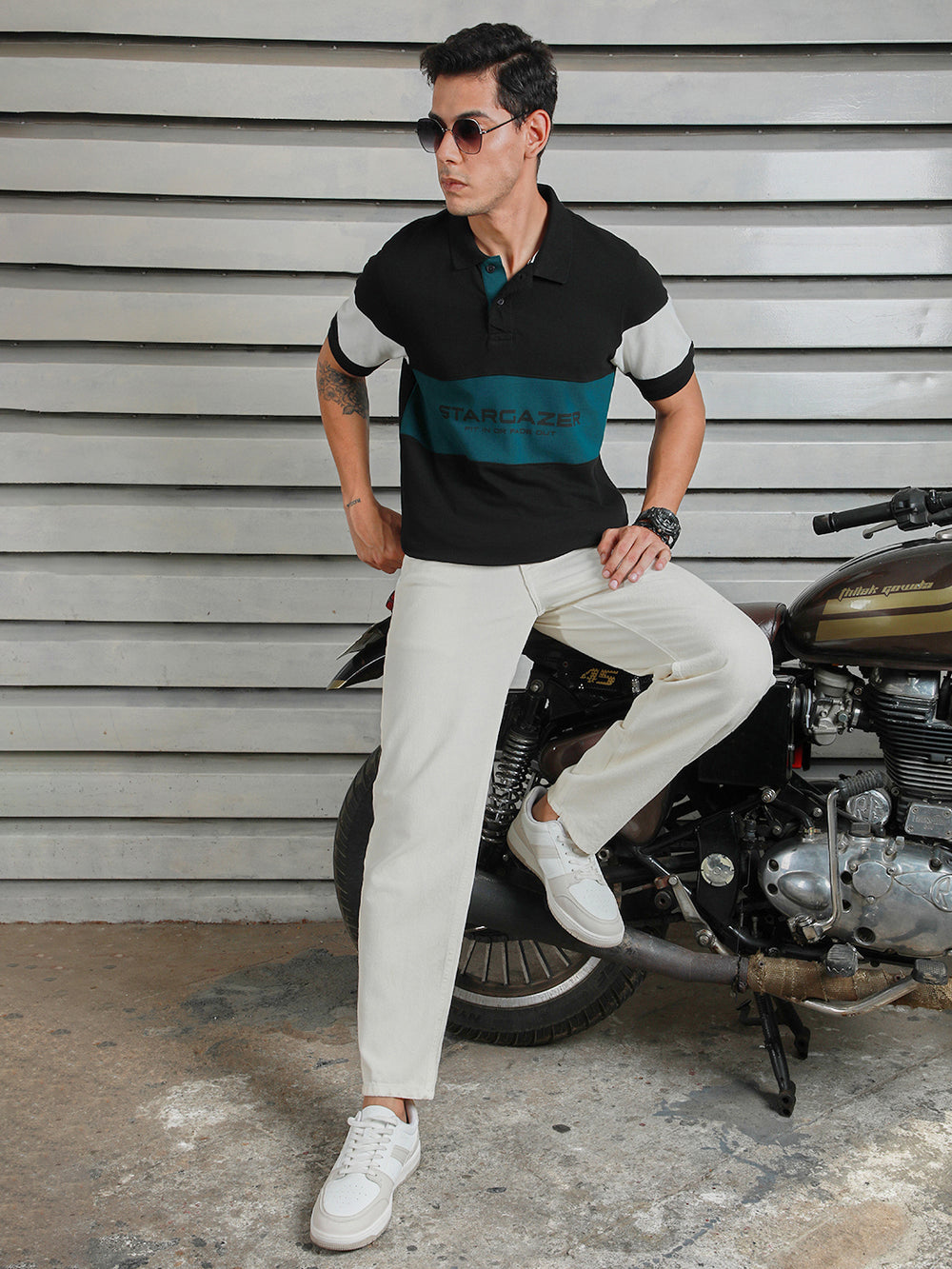 Men Polo Collar Typographic Colorblocked Cotton T-shirt