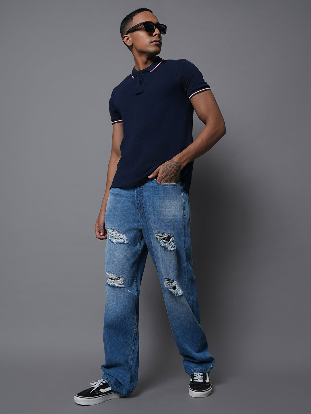 High Star Men Relaxed Straight Fit Mid-Rise Light Fade Distress Knee Cotton Jeans