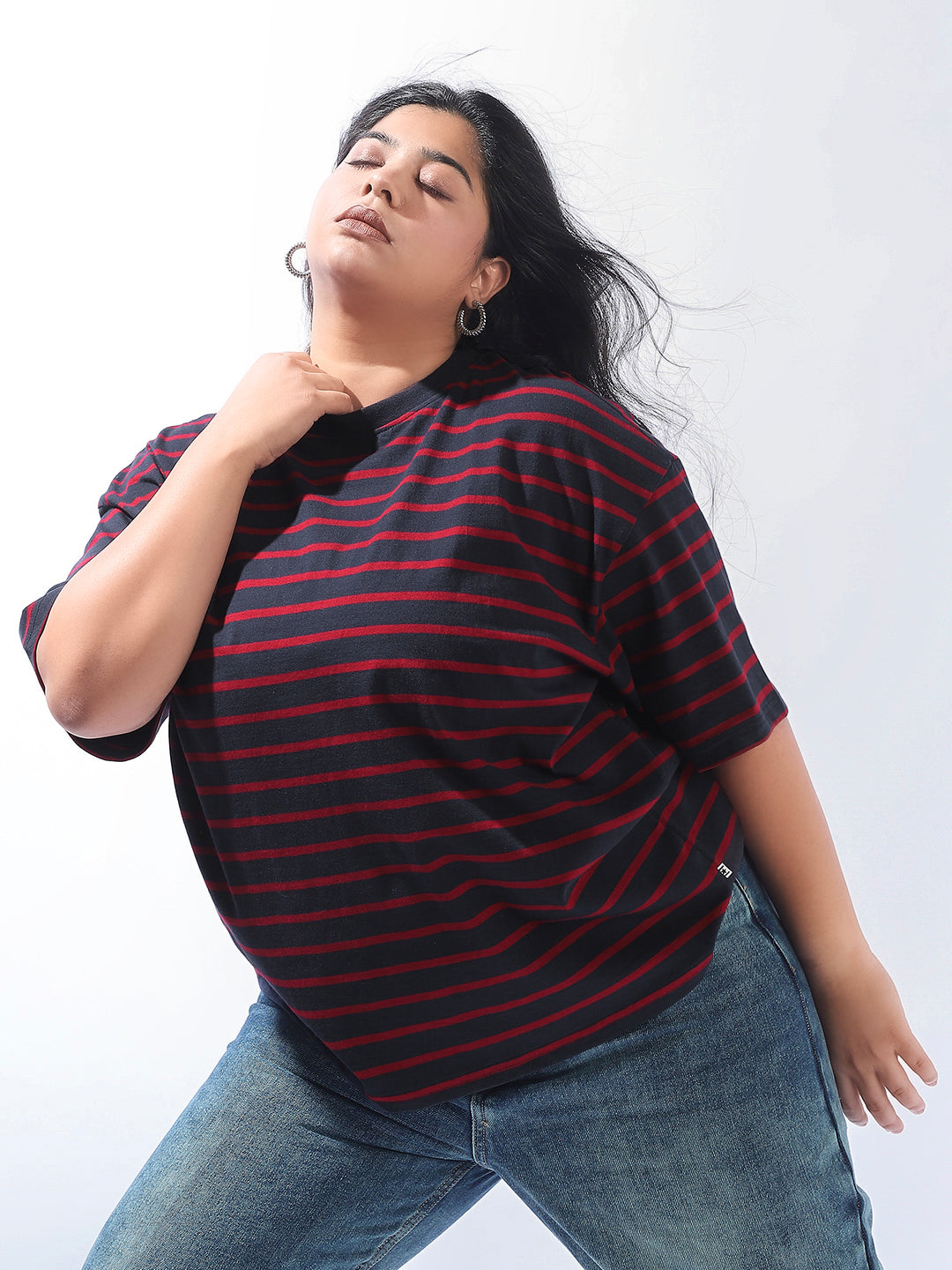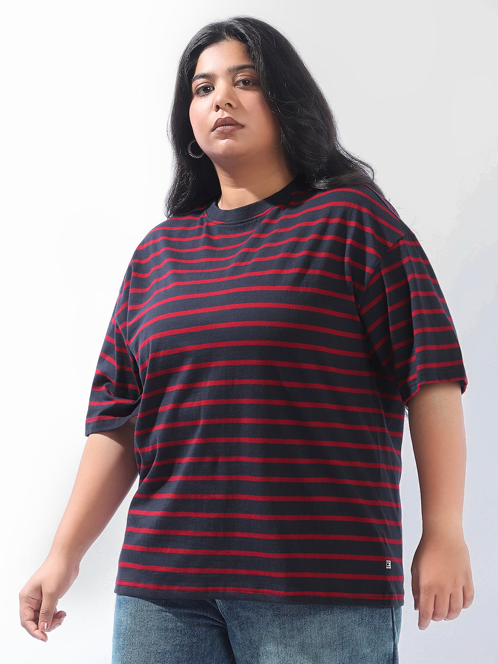 High Star Women Plus Stripes Oversized Fit Round Neck Half Sleeve Tshirts
